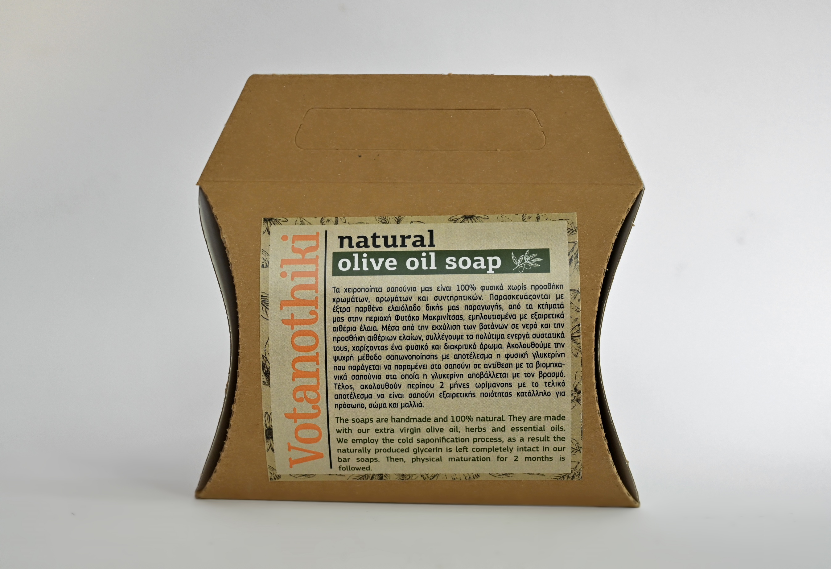 Τα χειροποίητα σαπούνια μας είναι 100% φυσικά χωρίς προσθήκη χρωμάτων, αρωμάτων και συντηρητικών. Παρασκευάζονται με έξτρα παρθένο ελαιόλαδο δικής μας παραγωγής, εκχυλίσματα βοτάνων και αιθέρια έλαια. Η εκχύλιση των βοτάνων με νερό μας προσφέρει όλα τα ενεργά συστατικά των αρωματικών φυτών και ήπιο φυσικό άρωμα. Ακολουθούμε την ψυχρή μέθοδο σαπωνοποίησης με αποτέλεσμα η φυσική γλυκερίνη που παράγεται να παραμένει στο σαπούνι. Μετά από δύο μήνες φυσικής ωρίμανσης είναι έτοιμο το εξαιρετικής ποιότητας σαπούνι μας κατάλληλο για πρόσωπο, σώμα και μαλλιά.