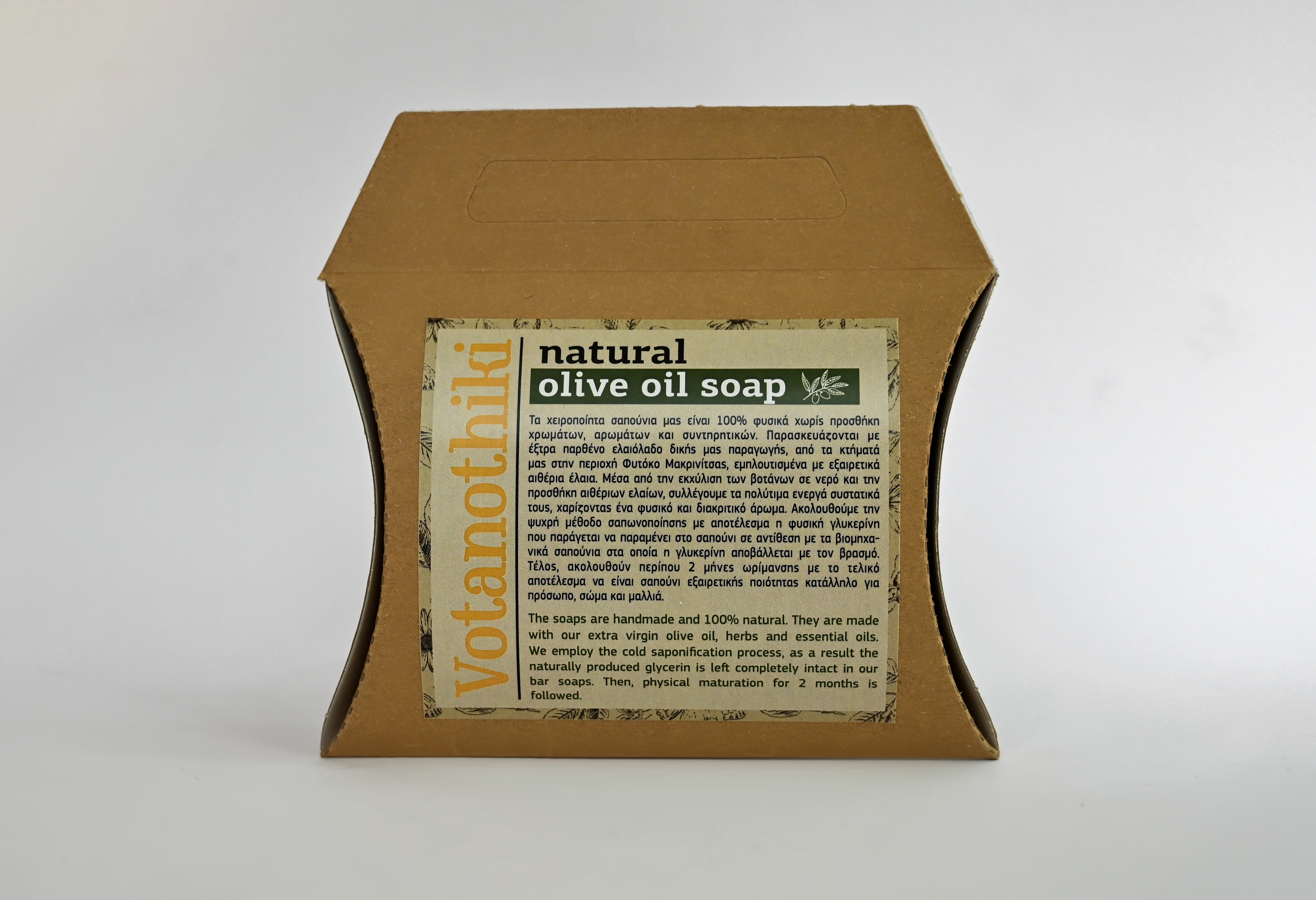 Τα χειροποίητα σαπούνια μας είναι 100% φυσικά χωρίς προσθήκη χρωμάτων, αρωμάτων και συντηρητικών. Παρασκευάζονται με έξτρα παρθένο ελαιόλαδο δικής μας παραγωγής, εκχυλίσματα βοτάνων και αιθέρια έλαια. Η εκχύλιση των βοτάνων με νερό μας προσφέρει όλα τα ενεργά συστατικά των αρωματικών φυτών και ήπιο φυσικό άρωμα. Ακολουθούμε την ψυχρή μέθοδο σαπωνοποίησης με αποτέλεσμα η φυσική γλυκερίνη που παράγεται να παραμένει στο σαπούνι. Μετά από δύο μήνες φυσικής ωρίμανσης είναι έτοιμο το εξαιρετικής ποιότητας σαπούνι μας κατάλληλο για πρόσωπο, σώμα και μαλλιά.